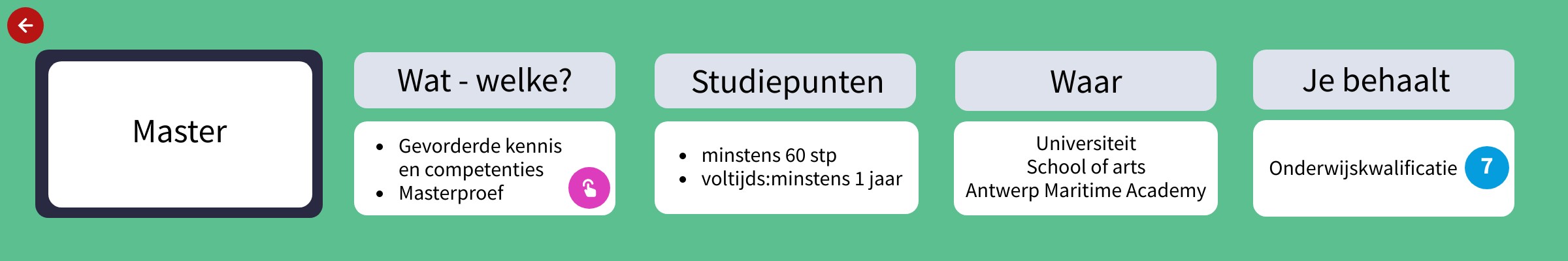 - Een masteropleiding volg je aan een universiteit, School of Arts of de Antwerp Maritime Academy.